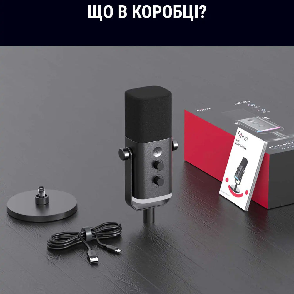 Комплектація: 1 X Мікрофон, 1 X Кабель USB, 1 X Стійка пантограф, 1 X Гвинтовий перехідник з 5/8", 3/8", 1 X Шестигранник, 1 X Кріплення до столу, 1 X Посібник користувача