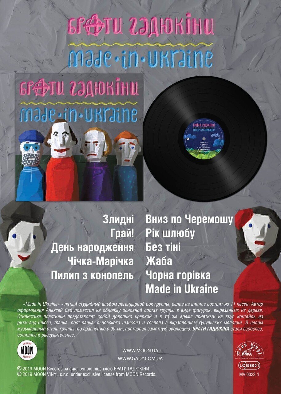 "Made in Ukraine" - п'ятий студійний альбом легендарного року гурту, реліз на вінілі складається з 11 пісень. Автор оформлення Олексій Сай помістив на обкладинку основний склад групи у вигляді фігурок, вирізаних із дерева.