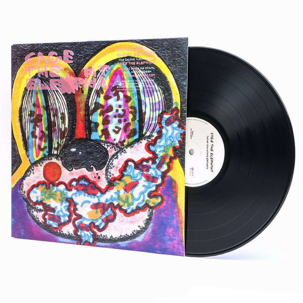 Cage The Elephant – Thank You Happy Birthday [LP] – другий студійний альбом американського рок-гурту Cage The Elephant, випущений у 2011 році. У платівці поєднано елементи альтернативного року, гаражного року та пост-панку, що створює впізнаване звучання гурту. Альбом відзначається динамічними композиціями та експресивною подачею, які підкреслюють характерну енергію колективу.