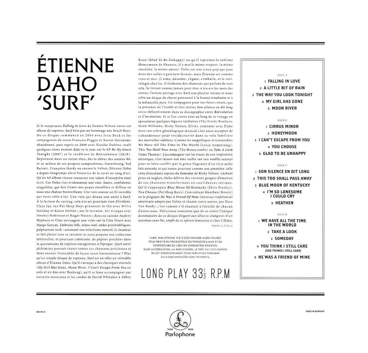 Цей подвійний вініл представляє розширене, ремастерингове видання альбому "Surf" французького співака Етьєна Дао, що спочатку вийшов у 1990 році. Це видання, ймовірно, включає додаткові матеріали, такі як ремікси, демо-версії або концертні записи.