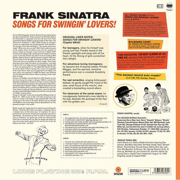 Frank Sinatra - Songs For Swingin' Lovers! [LP] — еталонна платівка в дискографії артиста та один із найважливіших релізів у стилі традиційного поп-вокалу. Записаний у співпраці з аранжувальником Нельсоном Рідлом, альбом став першим в історії, що очолив чарти Великобританії. Це класичне видання на важкому вінілі зберігає ту саму легкість, технічну досконалість та іронічну манеру виконання, за яку Синатру називають «The Voice».