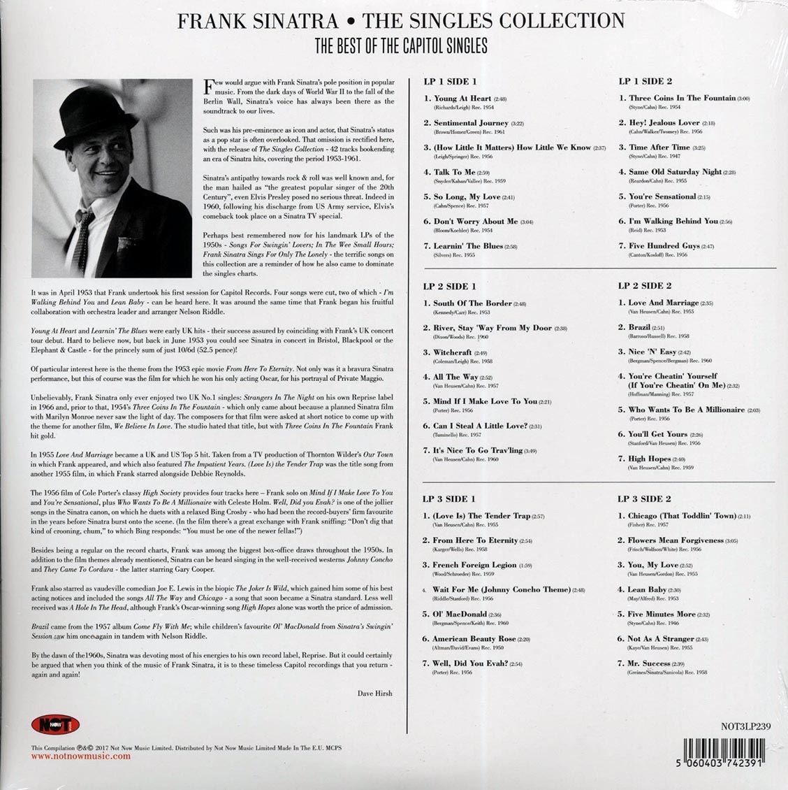 Цей потрійний вініл, виданий як кольорове видання, представляє збірку "The Singles Collection (The Best of the Capitol Singles)" від легендарного американського співака Френка Сінатри. Це видання фокусується на його знаковому періоді співпраці з лейблом Capitol Records, що тривав з 1953 по 1961 роки, і де були записані одні з його найвизначніших хітів.