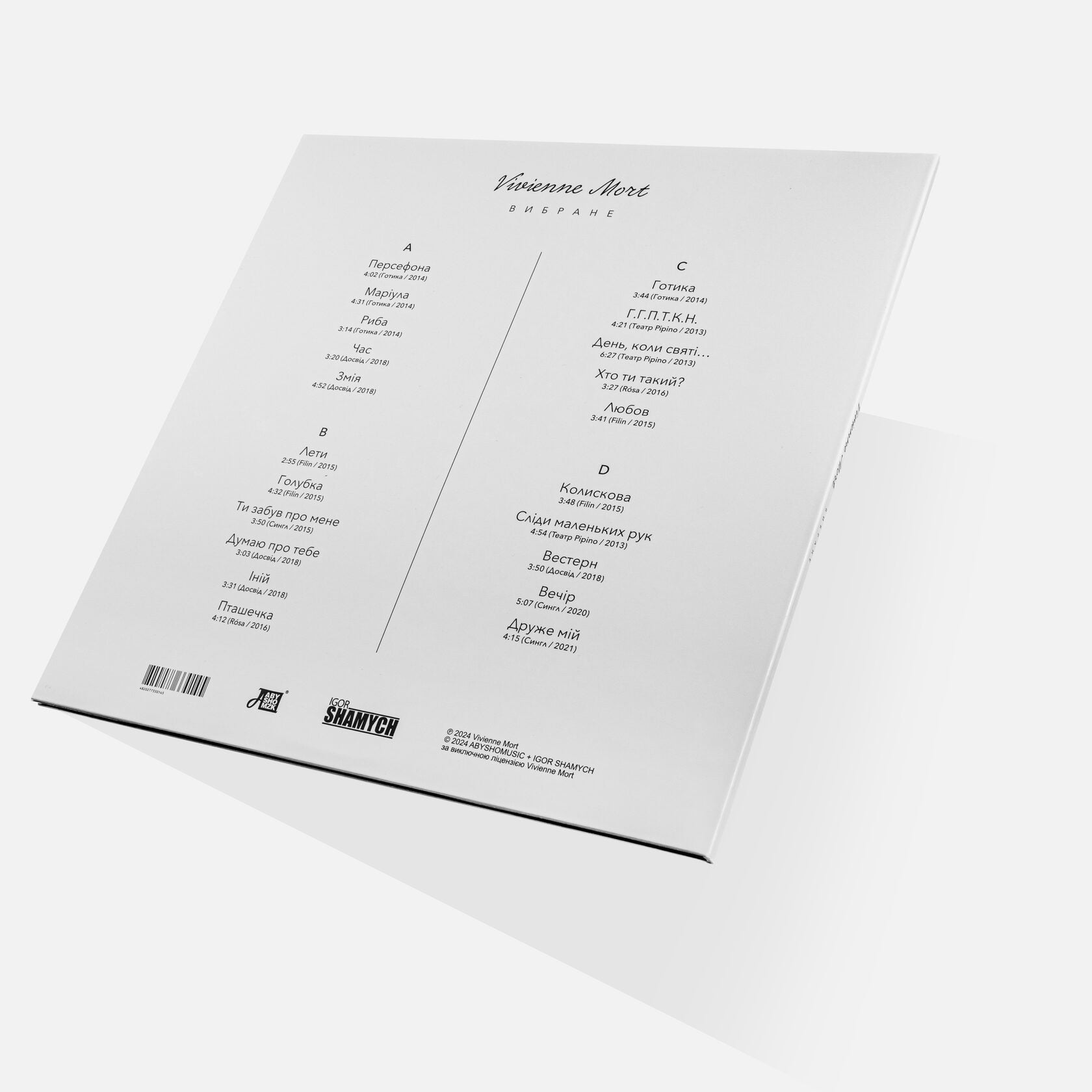 Ця вінілова платівка представляє "ВИБРАНЕ" – збірку найкращих пісень українського інді-рок / арт-рок гурту Vivienne Mort. Це видання є "Limited Edition" (лімітованим) і включає дві вінілові платівки, представлені на кольоровому вінілі, що робить його особливо цінним для колекціонерів та шанувальників української музики.