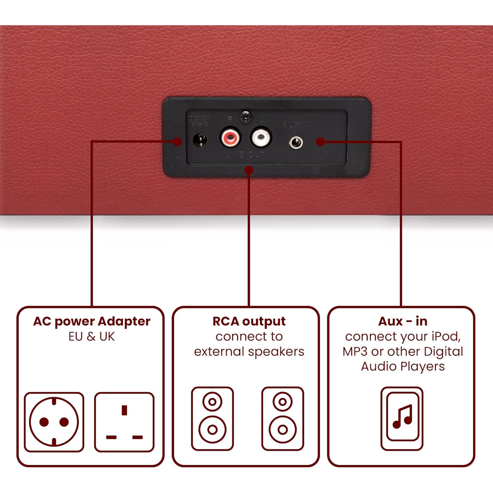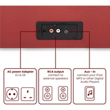 Програвач підтримує три швидкості обертання платівок, а також оснащений AUX-входом і RCA-виходами для підключення навушників або зовнішньої акустики. Його динаміки потужністю 10 Вт дарують м’який і чистий звук, якого цілком вистачить для домашнього прослуховування.