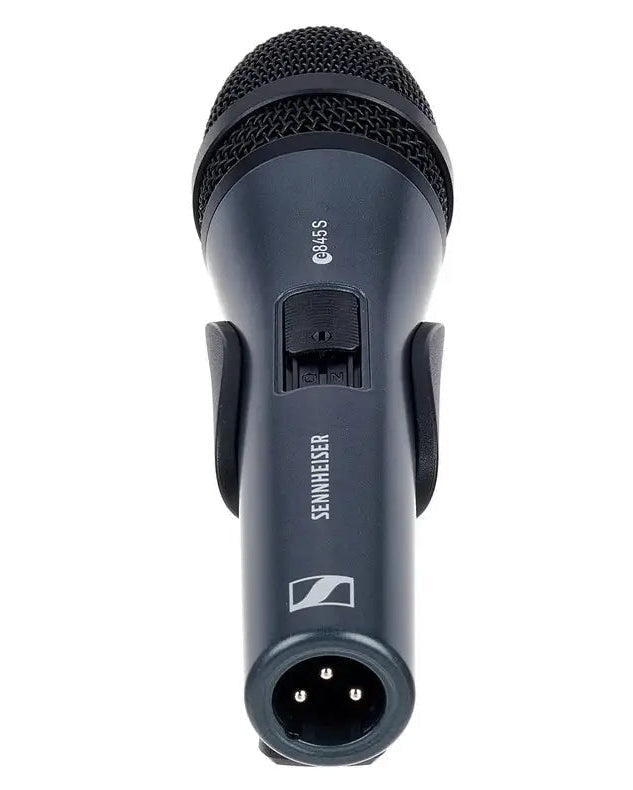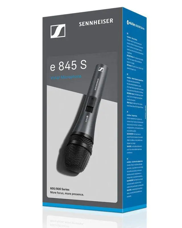 Sennheiser E 845-S — професійний сценічний мікрофон із суперкардіоїдною характеристикою, створений для ведучих, конферансьє та бек-вокалістів. Він забезпечує потужне, чітке й виразне звучання голосу навіть у складних музичних міксах та при високих рівнях гучності.