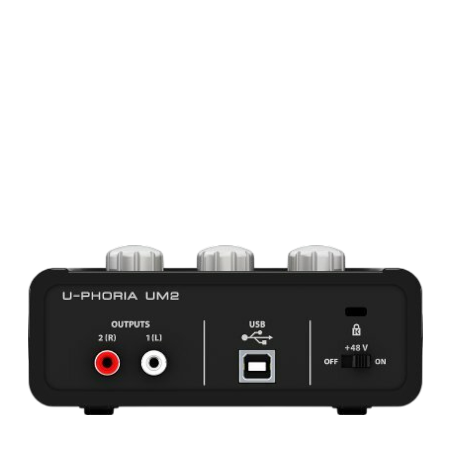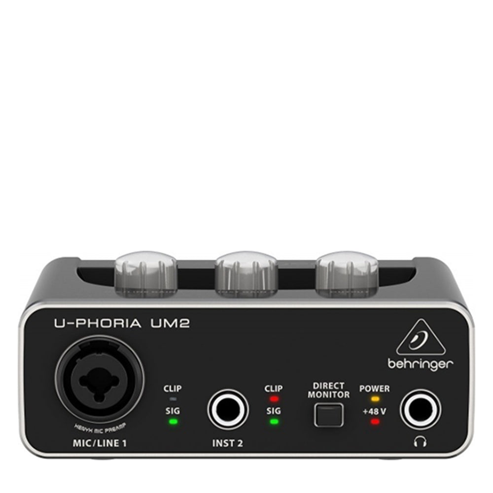 UM2 оснащений комбінованим входом XLR/TRS для мікрофона або інструменту та додатковим інструментальним входом 1/4", а також виходами для навушників і стерео лінійними RCA. Преамп XENYX з фантомним живленням +48 В забезпечує підтримку конденсаторних мікрофонів для високоякісного запису.