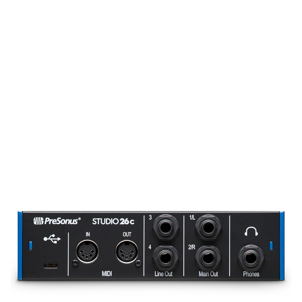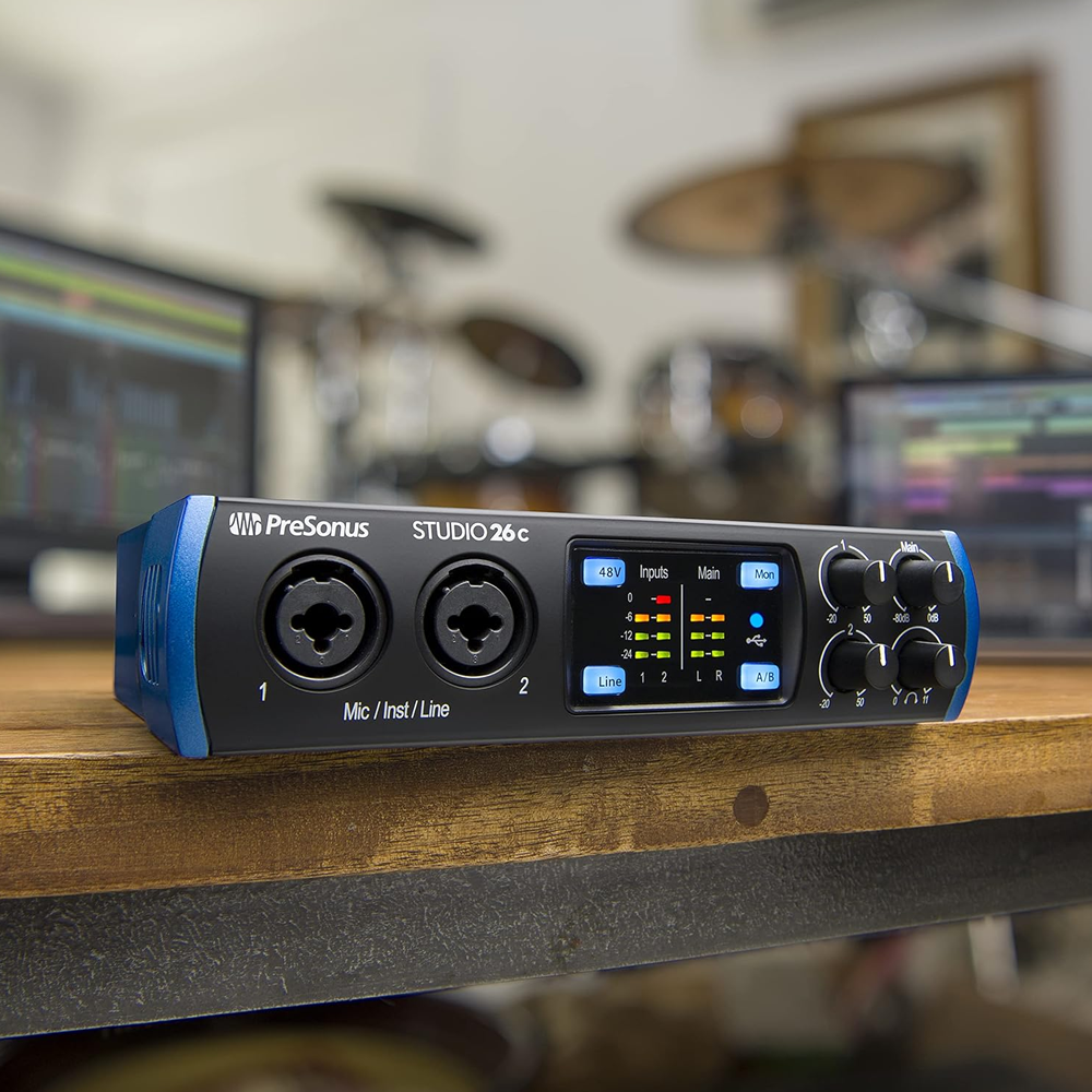 PreSonus Studio 26c — аудіо/MIDI-інтерфейс формату 2×4 з підключенням USB Type-C. Забезпечує високоякісний звук і постачається з потужним програмним пакетом для вокалістів, музикантів та подкастерів. Підходить як для домашньої студії, так і для мобільної роботи.