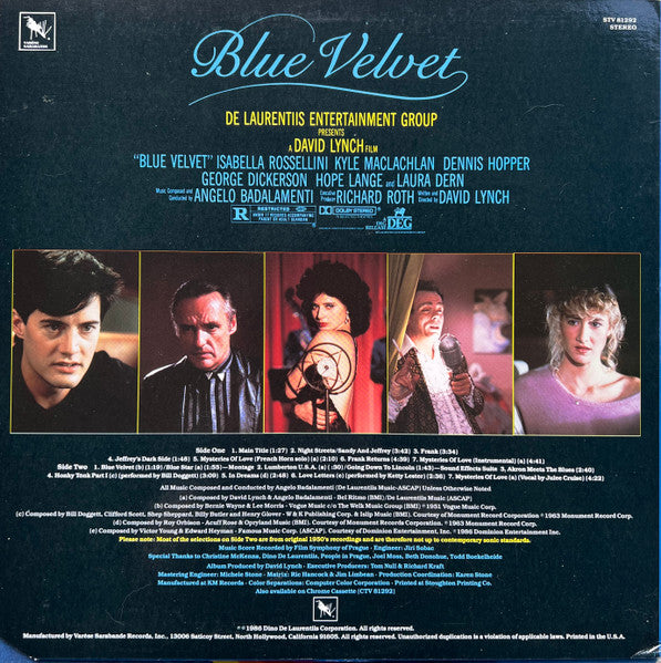 Платівка включає як оригінальні композиції Бадаламенті, так і вибрані пісні 1950–60-х років, серед яких культове виконання “Blue Velvet” у версії Боббі Вінтона. Саундтрек став невід’ємною частиною естетики фільму Лінча, підкреслюючи контраст між ідилічною поверхнею і прихованою темрявою, та став класикою кінематографічної музики.