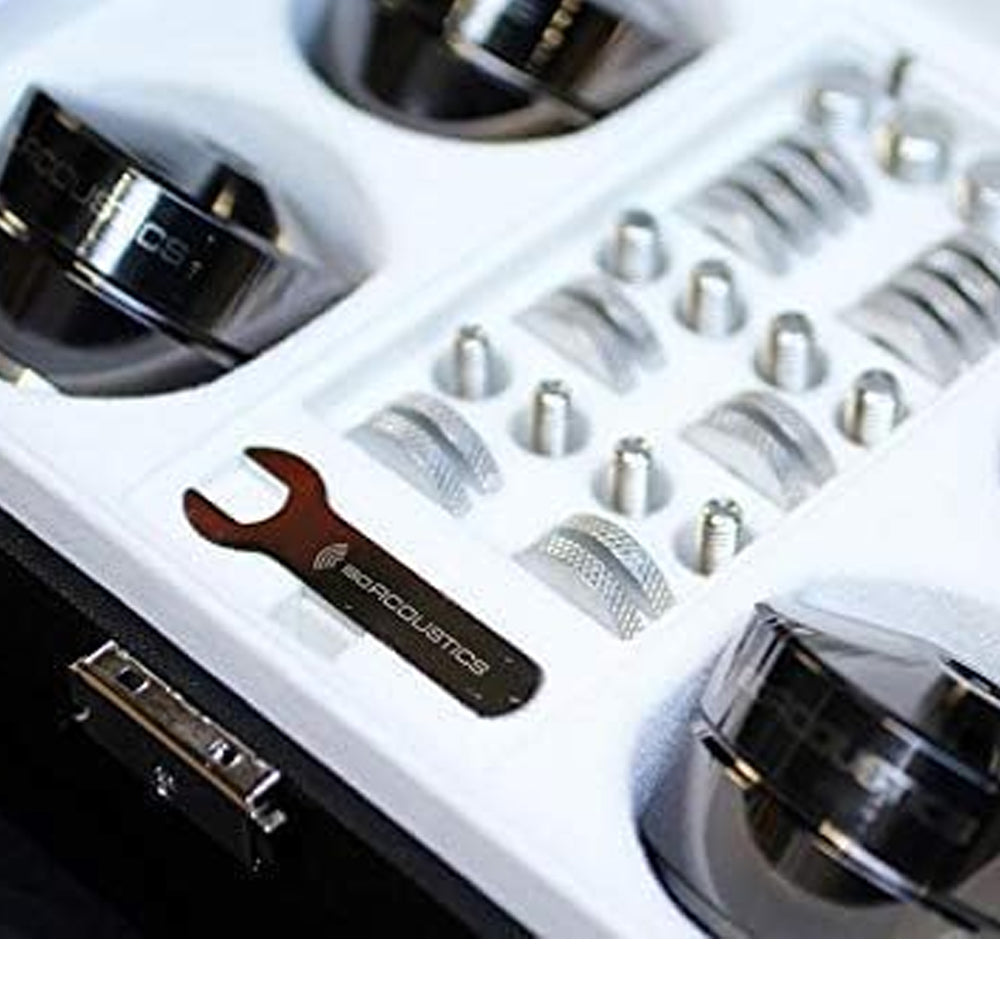 Монтаж максимально простий: оберіть відповідну різьбу для ваших колонок, вкрутіть адаптери та встановіть опори логотипом у напрямку до місця прослуховування — це забезпечує оптимальну ізоляцію й контроль. GAIA III розраховані на невеликі підлогові або поличні АС та активні монітори; комплект із 4 штук підходить для пари колонок (по 2 на кожну основу) або для однієї пари з 4 опорами під кожну колонку — залежно від конструкції підстави.