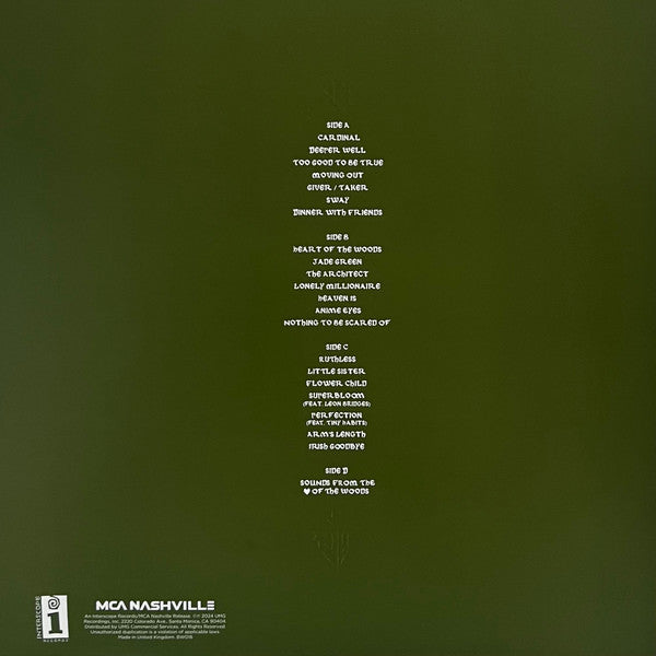 Це спеціальне колекційне видання виконано на двох платівках із зеленою рідиною всередині вінілових дисків, що створює захопливий візуальний ефект під час обертання. Рідкісний формат поєднує в собі мистецький дизайн і високу якість звучання, роблячи цей реліз справжнім предметом гордості для поціновувачів вінілових релізів і шанувальників сучасної кантрі та інді-музики.