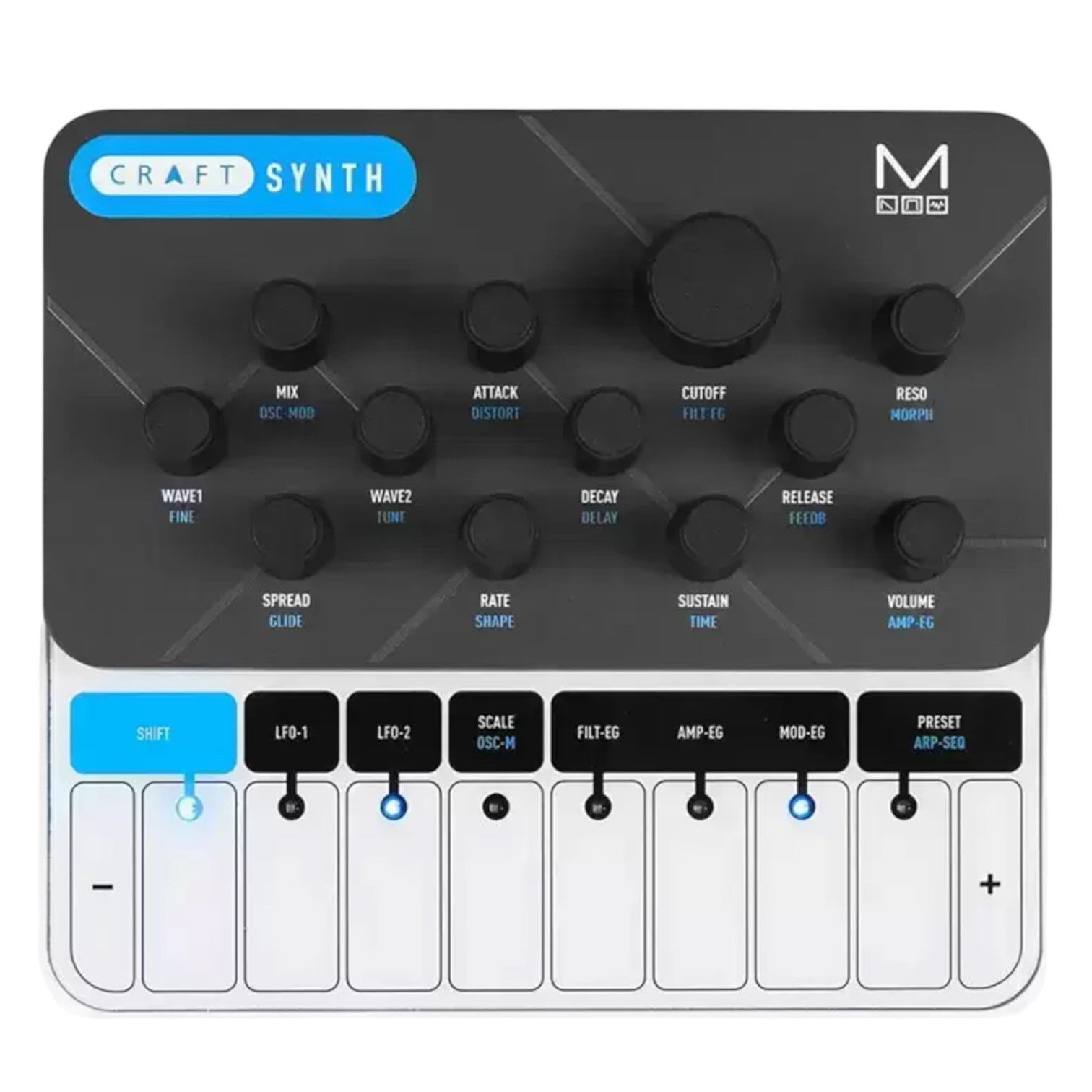 Modal Electronics CRAFTsynth v2.0 — компактний монофонічний хвильовий синтезатор для швидкого саунд-дизайну в студії та на сцені. Морфінг хвиль осциляторів, резонансний фільтр зі змінним типом і гнучкі модуляції дозволяють створювати від щільних басів та агресивних лід-партій до атмосферних текстур. Інтуїтивні органи керування дають змогу будувати патчі без зайвого меню-дайвингу, а пам’ять пресетів спрощує робочий процес.
