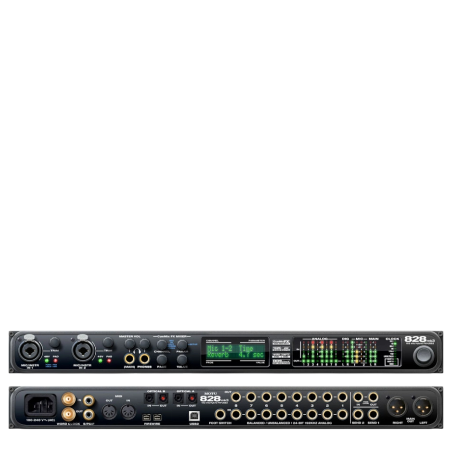 MOTU 828mk3 Hybrid оснащений 10 аналоговими каналами запису та відтворення, 16 цифровими ADAT-входами/виходами та стерео S/PDIF каналом. Пристрій підтримує каскадне з’єднання для розширення системи за допомогою додаткових інтерфейсів MOTU, таких як 8pre. Вбудований цифровий мікшер CueMix FX дозволяє здійснювати моніторинг без затримки, додаючи ефекти EQ, компресор і реверберацію у реальному часі. Завдяки своїй універсальності 828mk3 Hybrid ідеально підходить для професійних студій, музикантів і продюсерів, які цінують точність, надійність і зручність роботи.