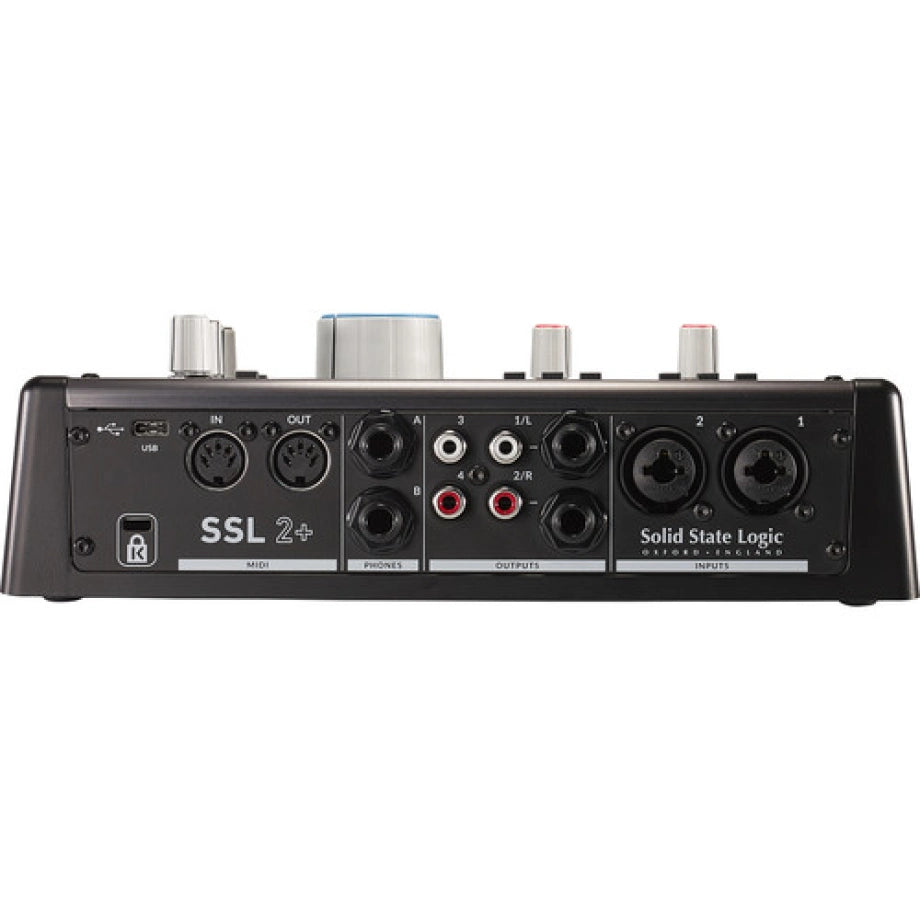 SSL2+ оснащено розширеними комутаційними можливостями: 2 XLR/TRS комбінованих входи, 2 TRS балансні L/R виходи, 4 RCA виходи, 2 виходи для навушників із незалежним керуванням гучністю, а також MIDI In/Out для підключення зовнішніх пристроїв. Металевий корпус із надійними компонентами, роз’ємами Neutrik і потенціометрами Alps гарантує довговічність навіть у польових умовах. Інтерфейс живиться через USB-C і не потребує зовнішнього адаптера. У комплект входить програмне забезпечення від Avid, Ableton, Native Instruments, а також 1,5 ГБ семплів від Loopcloud. Окрім цього, користувачі отримують фірмові плагіни SSL — Vocalstrip 2 і Drumstrip.