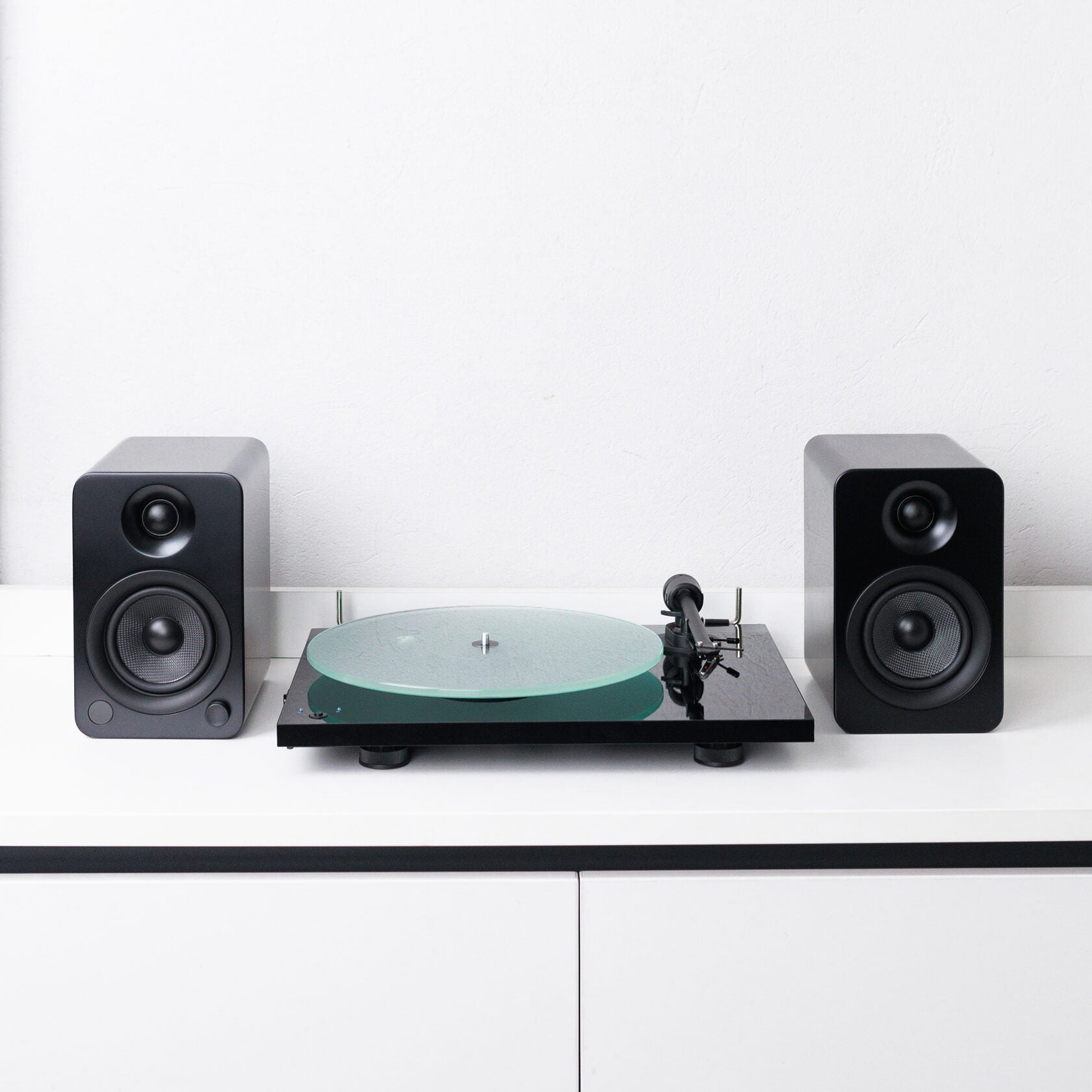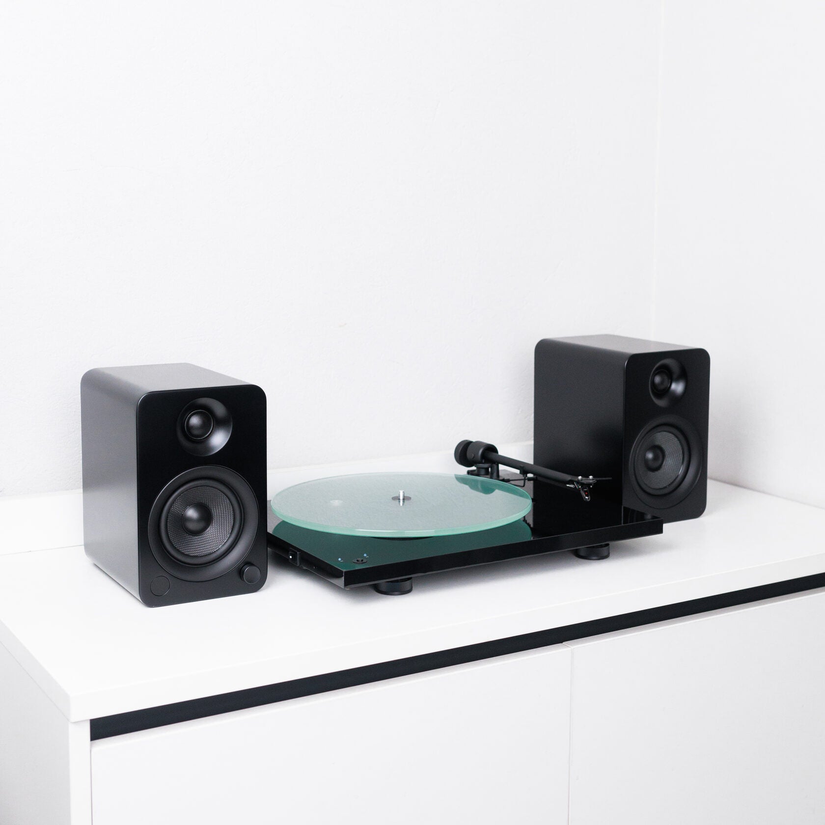 Програвач вінілу Pro-Ject T1 Phono SB OM5e у чорному Piano Black у поєднанні з активною акустикою Kanto YU4 Black утворює готову систему для якісного відтворення вінілових платівок.
