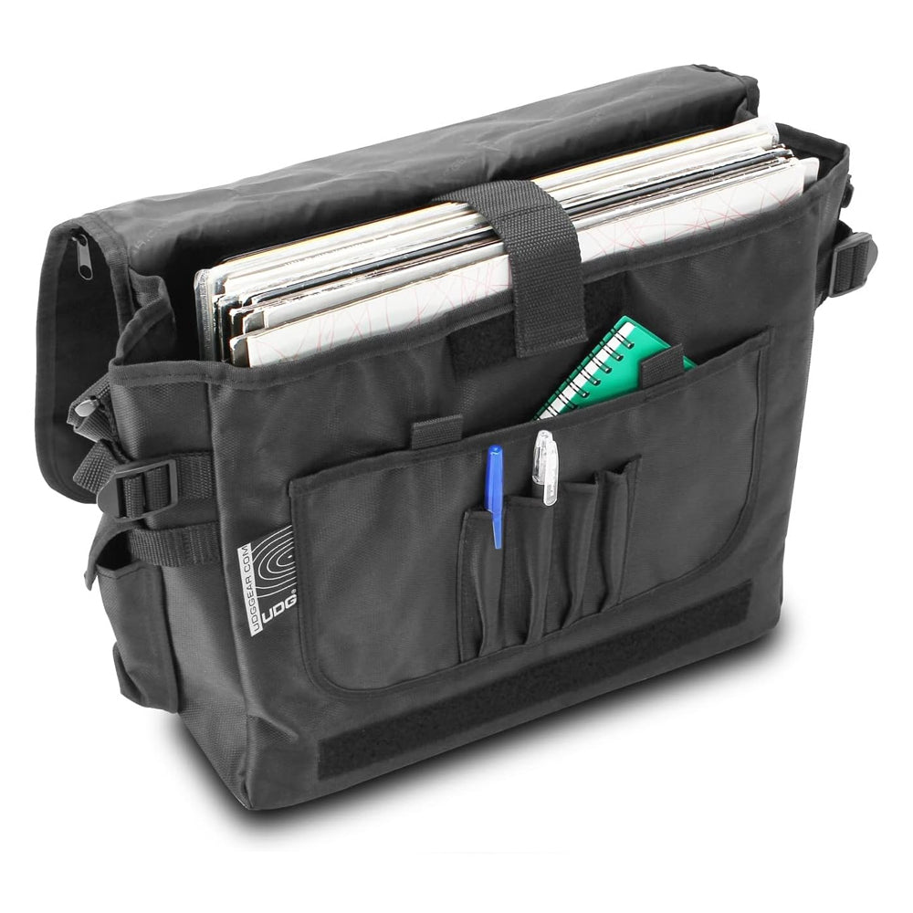 UDG Ultimate CourierBag - Black — міцна сумка-месенджер для діджеїв, продюсерів і саунд-інженерів, що тримає форму та надійно захищає вміст у поїздках між студією і клубом. Місткий основний відсік формату 12" з м’якою підкладкою зручно розміщує робочі речі: платівки, компактний контролер, навушники чи ноутбук (за потреби). Фронтальні та внутрішні органайзери впорядковують кабелі, флешки, картки пам’яті та дрібні аксесуари — усе швидко знаходиться й лишається під рукою.